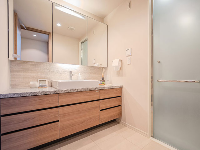 家族構成に合わせた収納最適化で洗面周りをすっきり整え、使いやすい高さや配置の洗面台で機能性を高めます。
