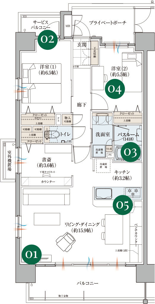 ◆サービスバルコニーやプライベートポーチは角部屋の特権です!