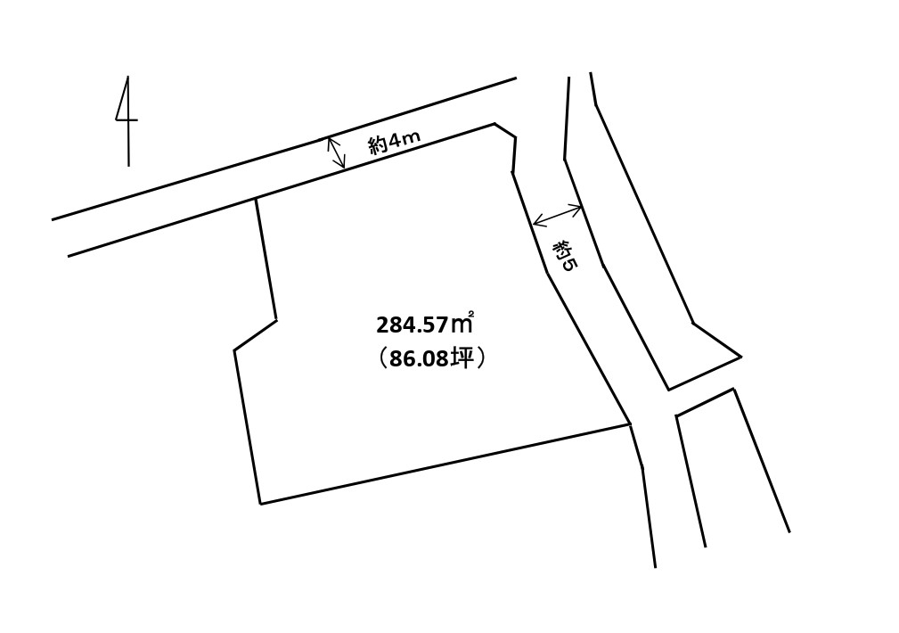 - ・北側(幅員約4m)市道に約14m接面 ・東側(幅員約5m)に約7m接面