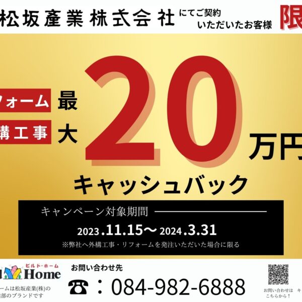 【最大20万円!】外構・リフォームキャッシュバックキャンペーン実施中!