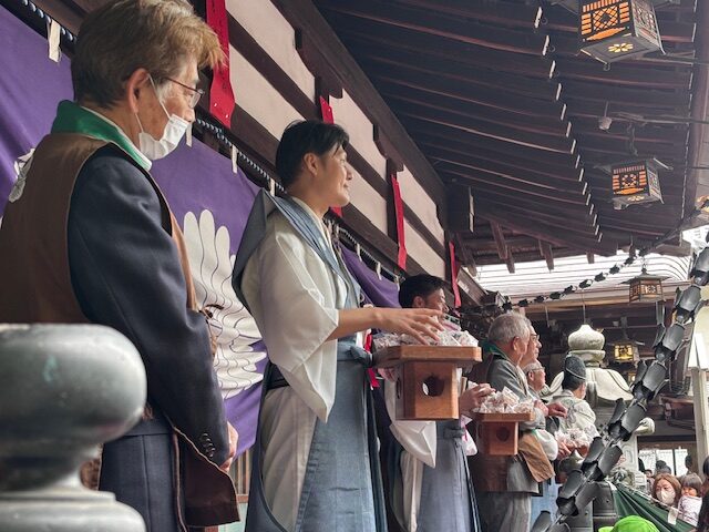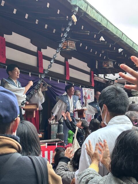 艮神社の節分祭は個包装された豆やお餅を年男の方々がまいてくれるんですよ!