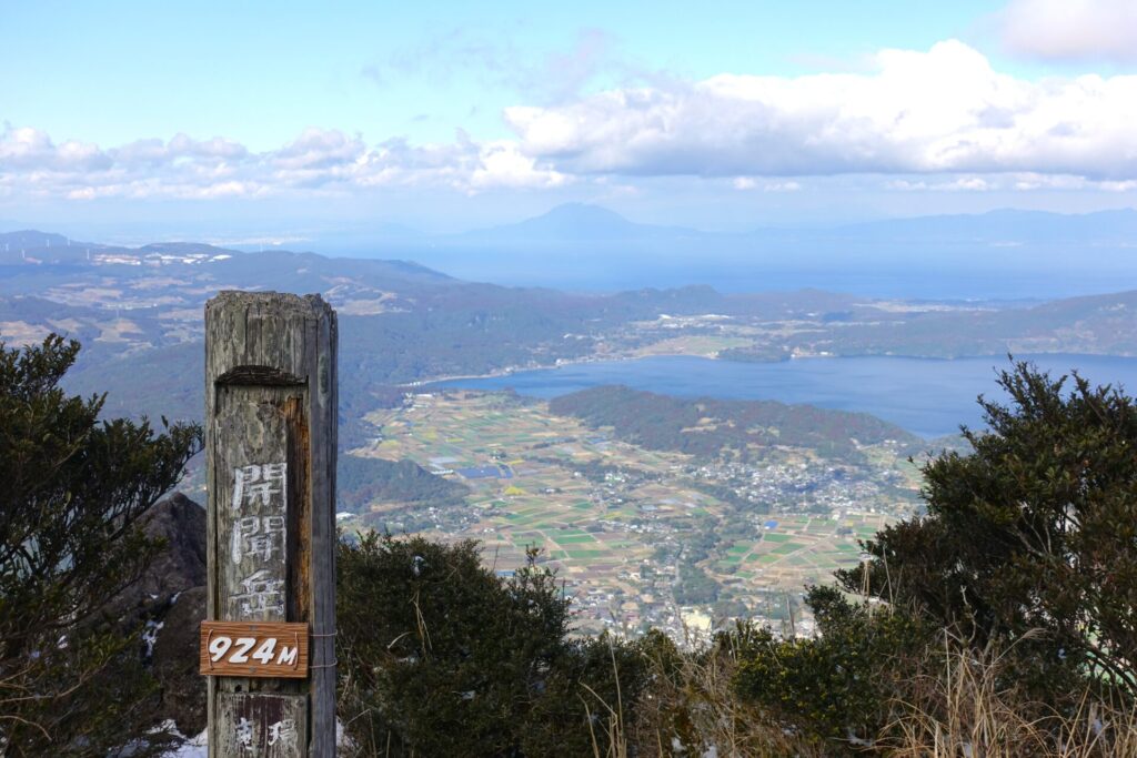 天気もまずまずで、標高924mから臨む指宿の市街が綺麗に見渡せましたが、頂上付近に積雪があり、まさか鹿児島で雪用の登山装備が必要とは思わず、やっとの思いで頂上まで往復する事が出来ました。