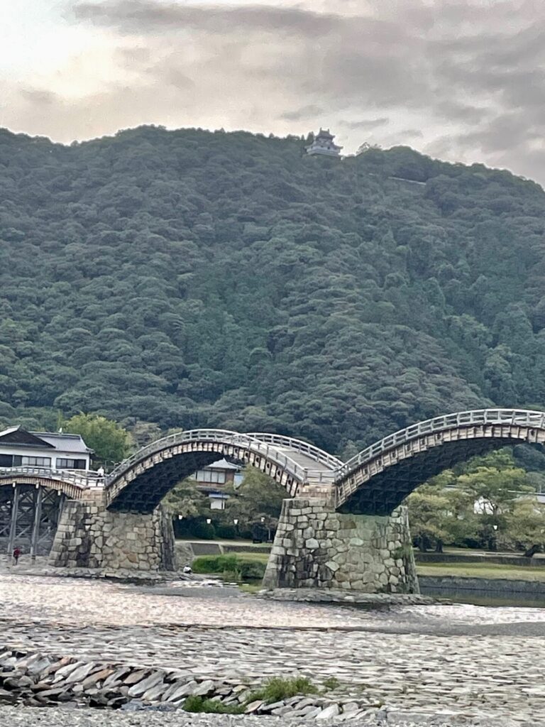 夕方になり、岩国城へは上がる時間がなかったですが、薄暗くなりライトアップされた約200mの錦帯橋と山の上に浮かぶ岩国城はとても幻想的でした