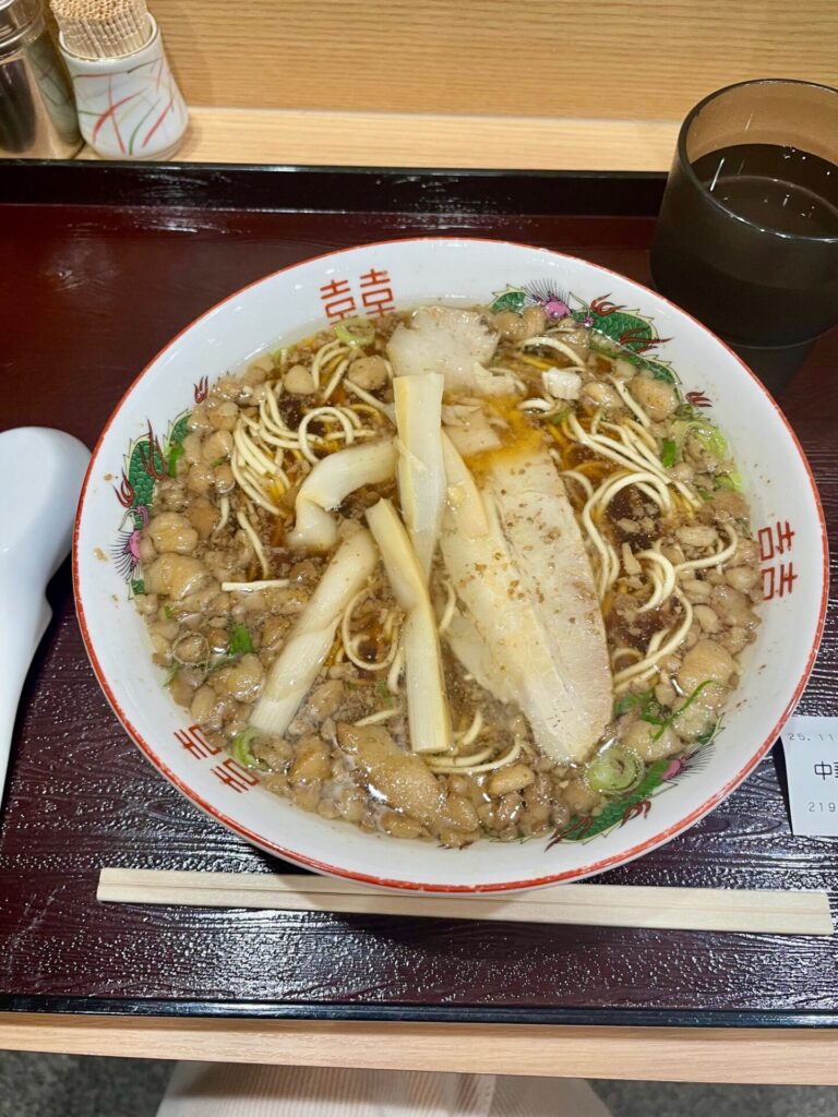 背脂がゴロゴロ入って食べごたえがあり、チャーシューは大きくて柔らかく、麺は細麺でスープの濃さも丁度よく、とっても美味しかったです