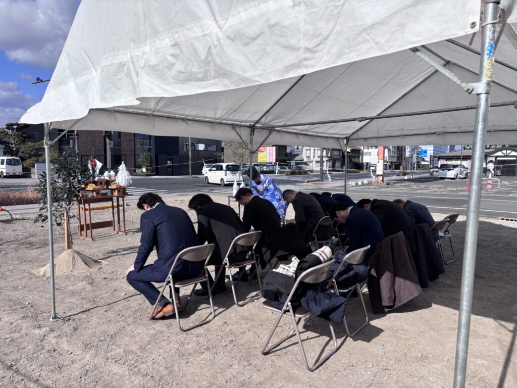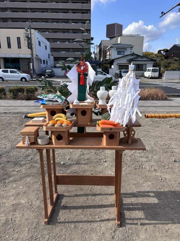 これは工事の安全と、建物が末永く繁栄することを願い、土地の神様へご挨拶をする日本の伝統的な儀式です。
