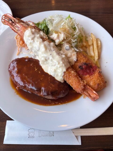注文したのは、エビフライ・カニクリームコロッケ・ハンバーグがセットになった、なんとも夢のあるプレート!