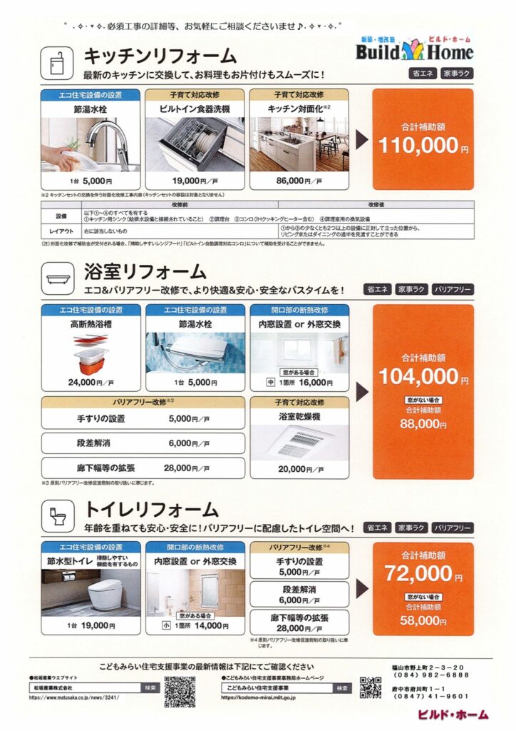 いろいろな制限がございますので、この工事は対象かな?と疑問に思われる場合は、こどもみらい住宅事業者登録店の弊社に、是非ご相談ください。