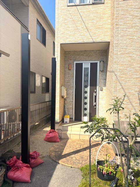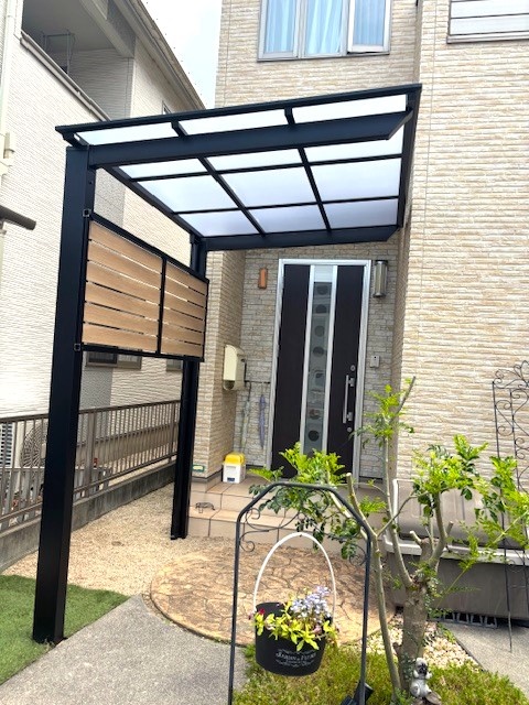 費用は抑えつつ、お洒落に『玄関の日除け&アプローチの雨除け』を実現する事ができ、大変喜んで頂きました